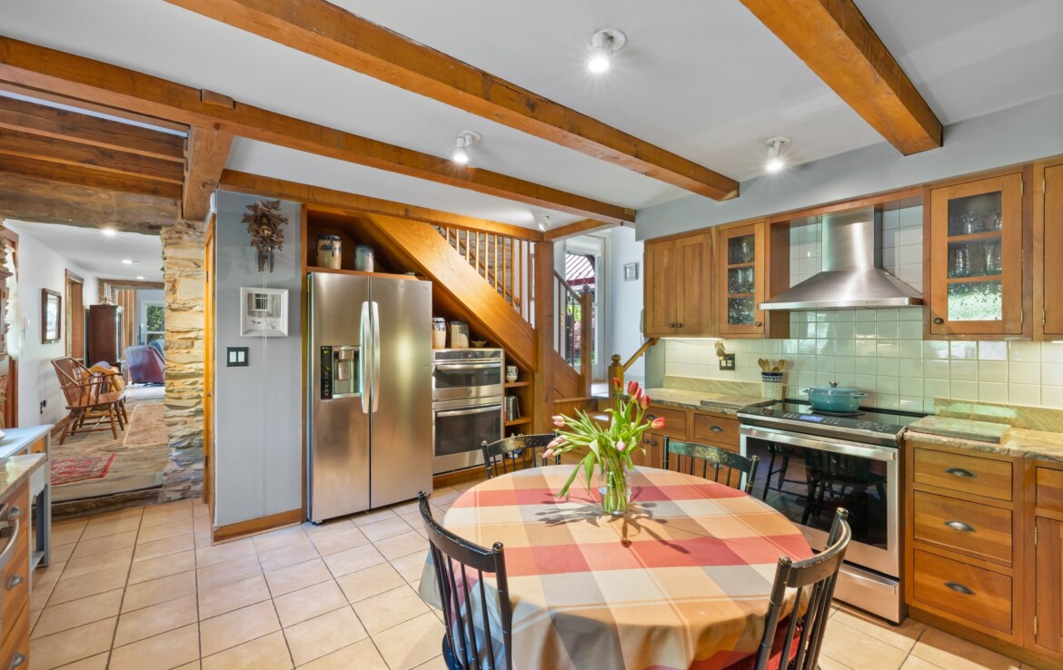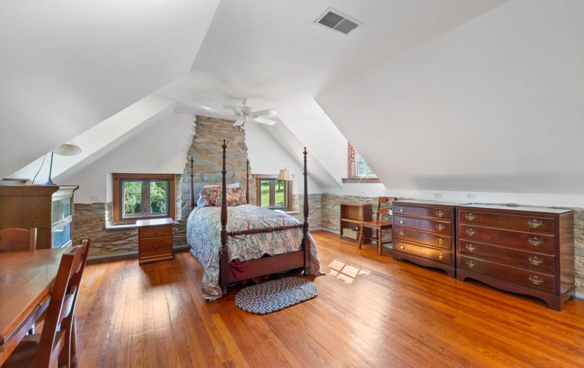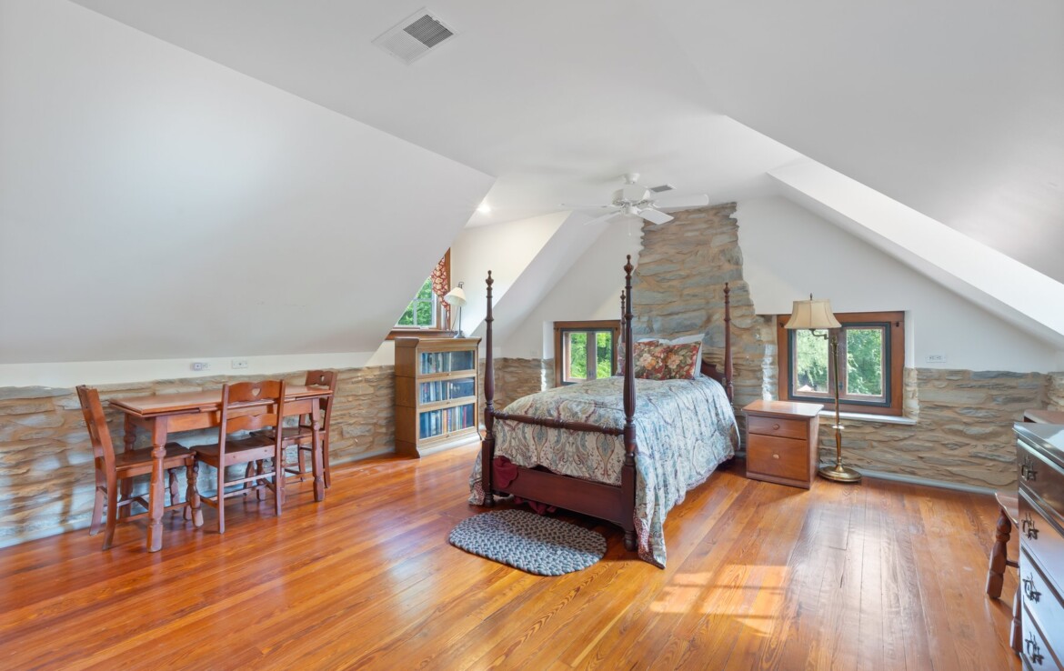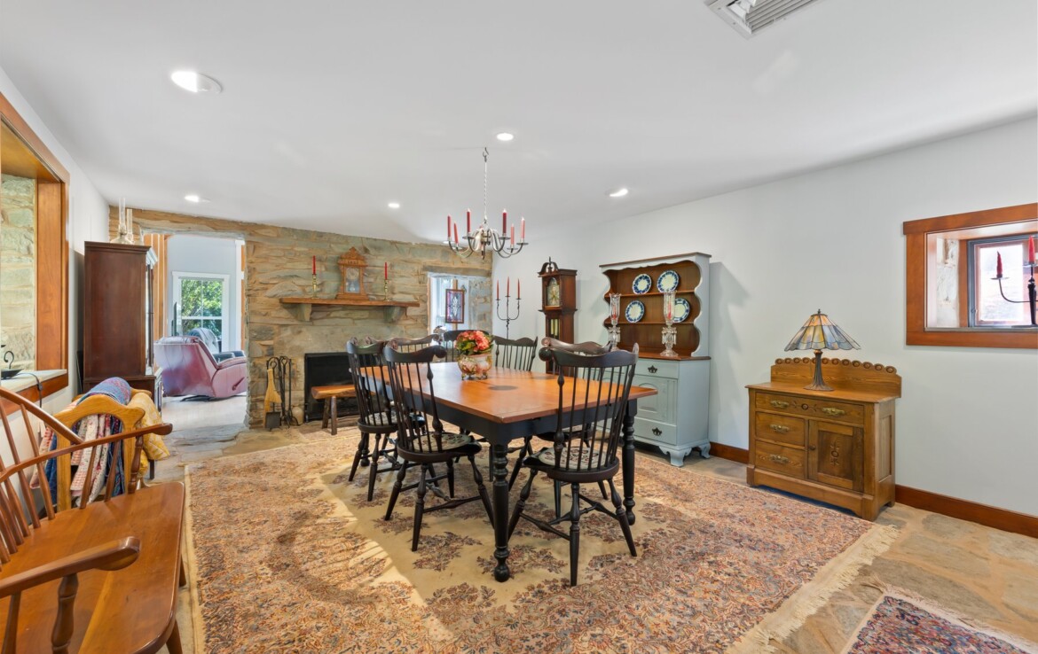 The core of this early 19th century stone dwelling was fully restored, repointed, and adapted to modern living in 1998 -to- 2000 as a 21⁄2 story historic home surrounded by a 25-acre farmland property. A modern kitchen, first floor bedroom, and a sun room were added to the core during restoration.