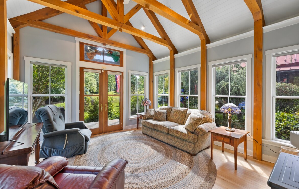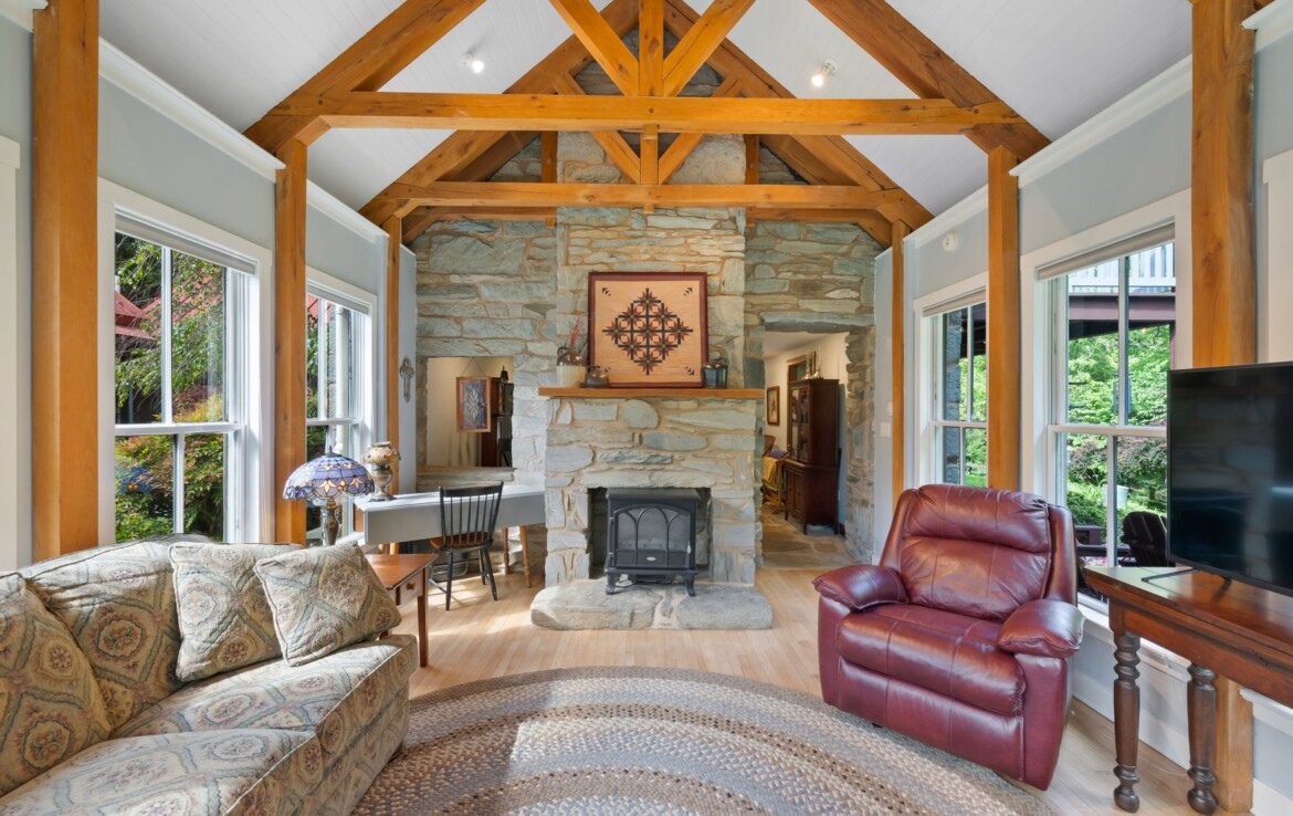 Sun Room 19′ x 13′ – Wood floor, 15’+ ceiling with exposed wood beams, stone wall with fireplace (gas) and wood mantel, French doors to the patio, 2 ceiling fans, 11 windows.
