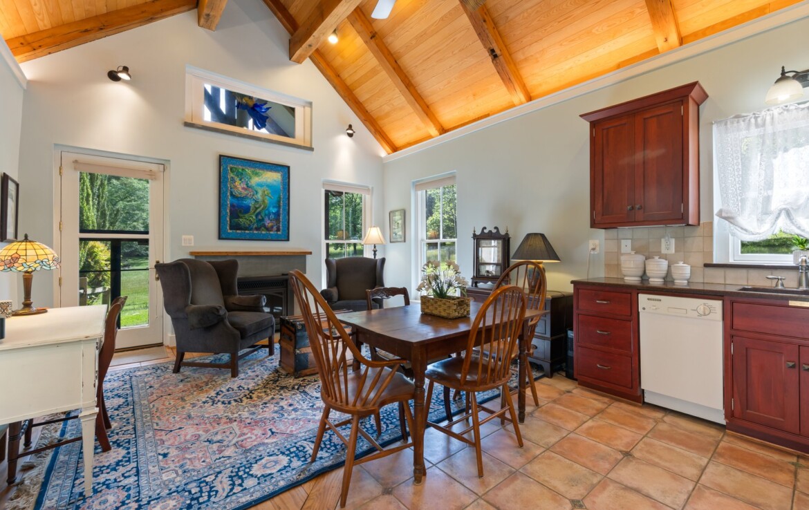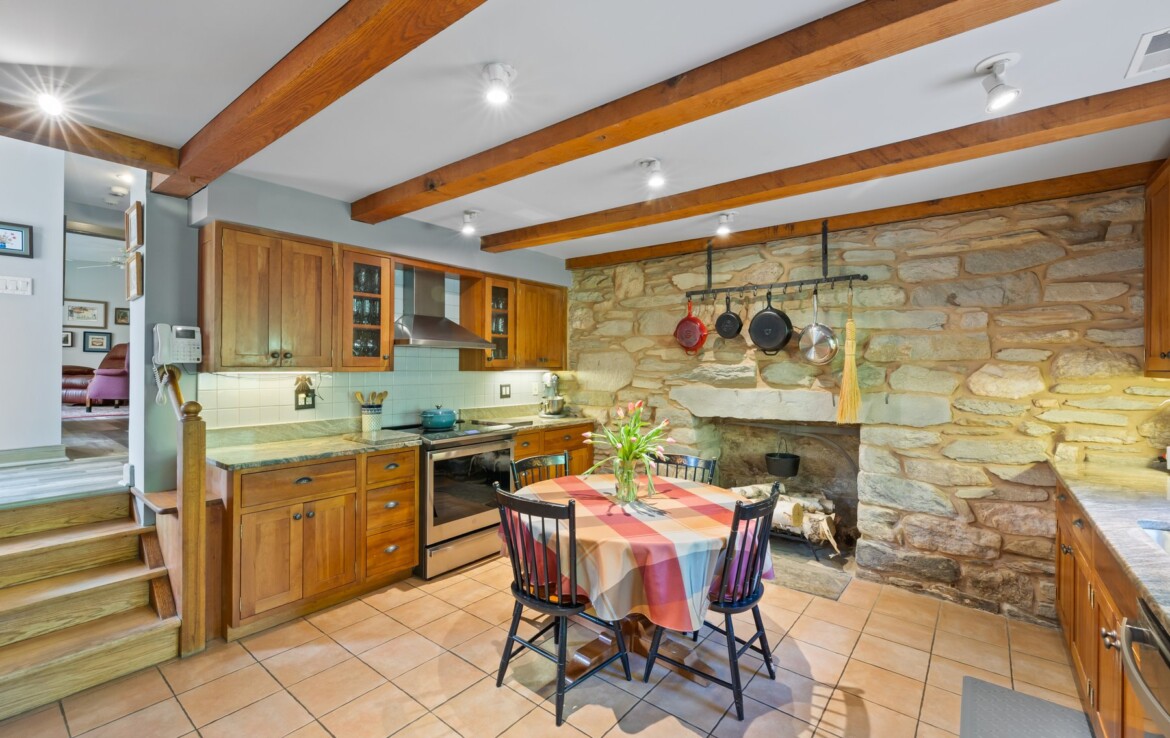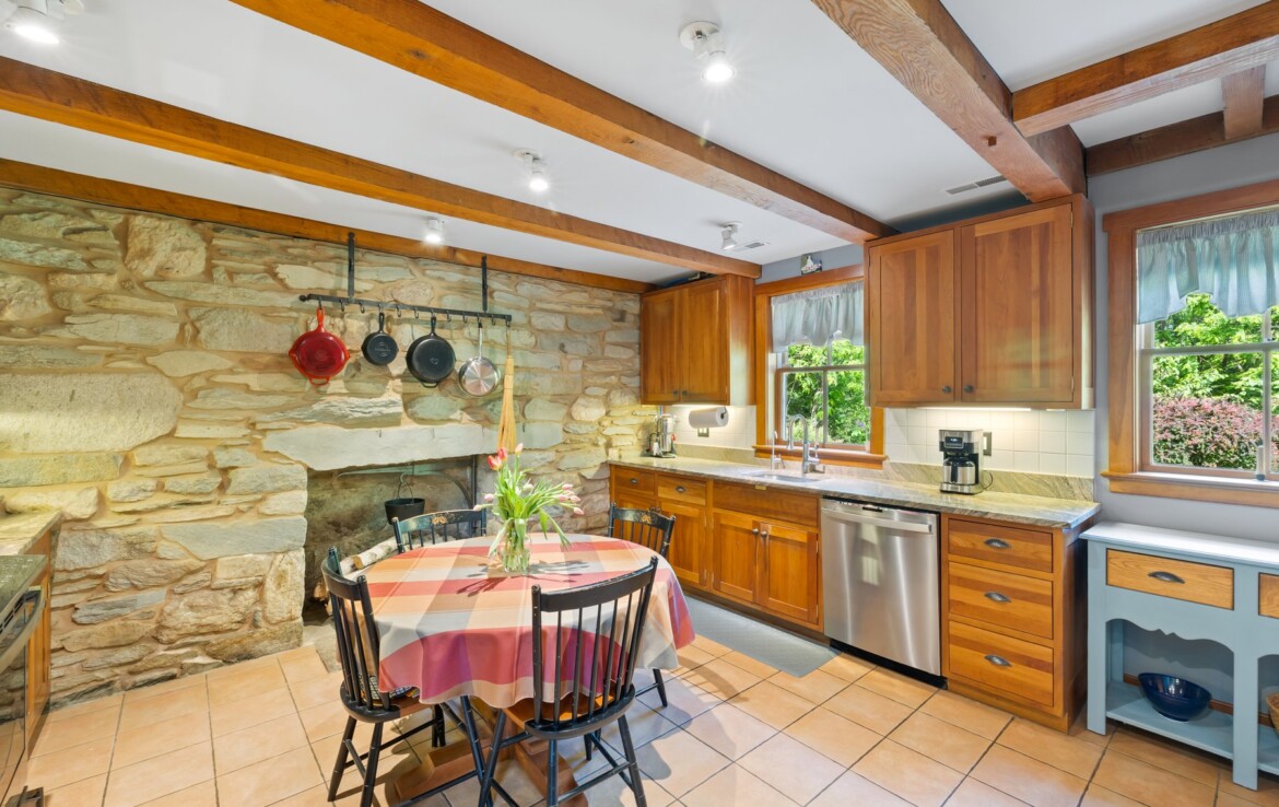 Kitchen 14′ x 13′ – Tile floor with radiant heat, stone wall with fireplace (gas), custom cabinets, exposed wood beam ceiling, stainless steel appliances, granite counters, 2 windows.