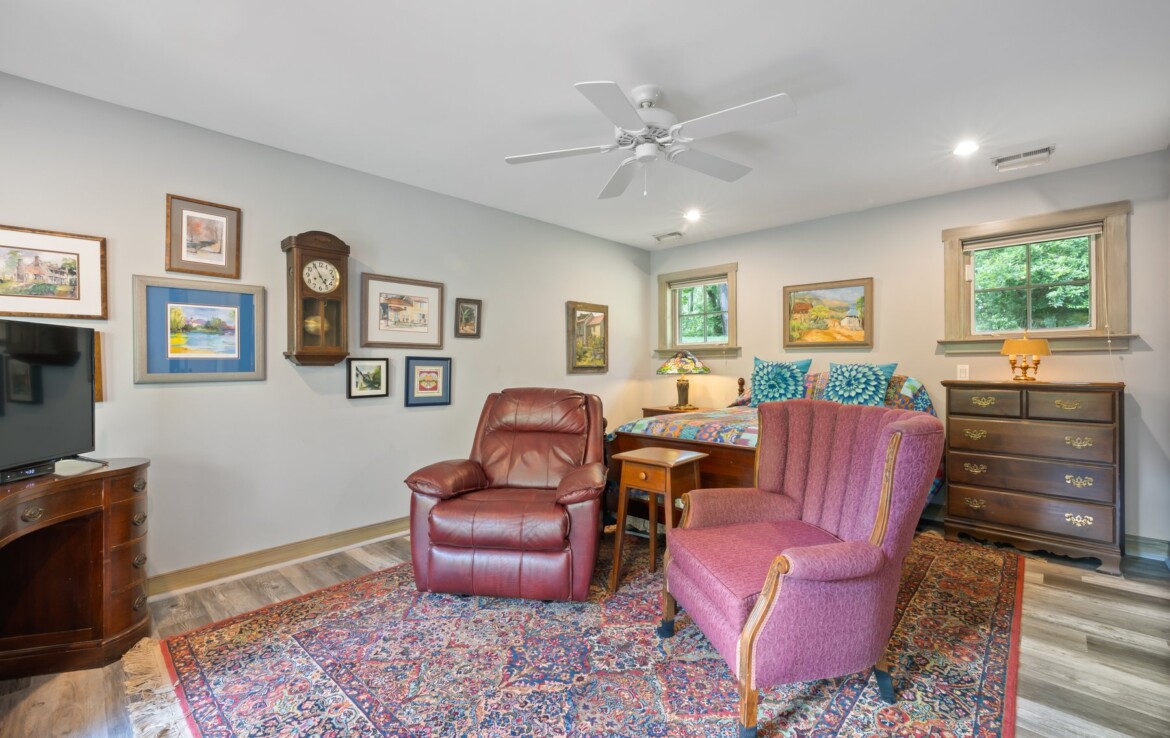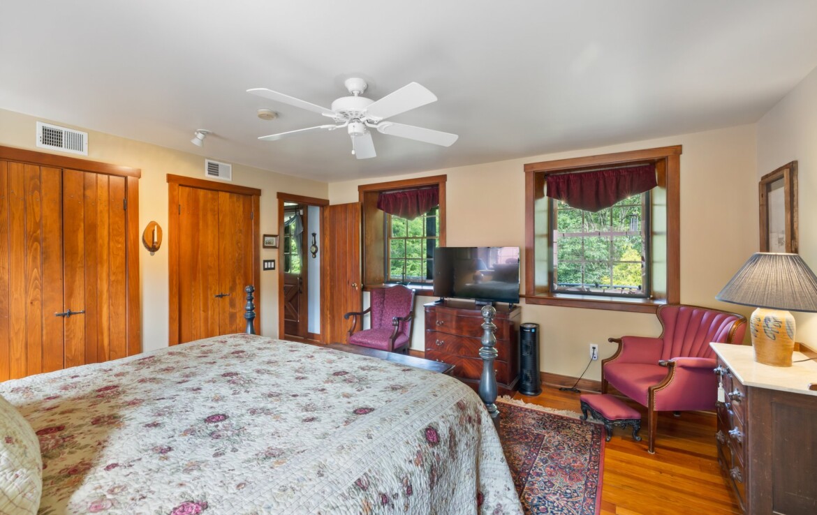 Bedroom 2 15′ x 15′ – Wood floor, ceiling fan, fireplace (gas), recessed lighting, 3 closets, 4 window.