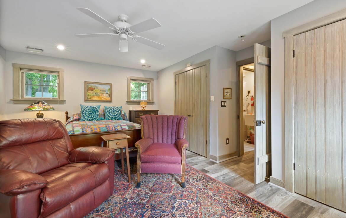 Bedroom 3 17′ x 14′ – Wood floor, stone half wall, 2 ceiling fans, 6 windows.