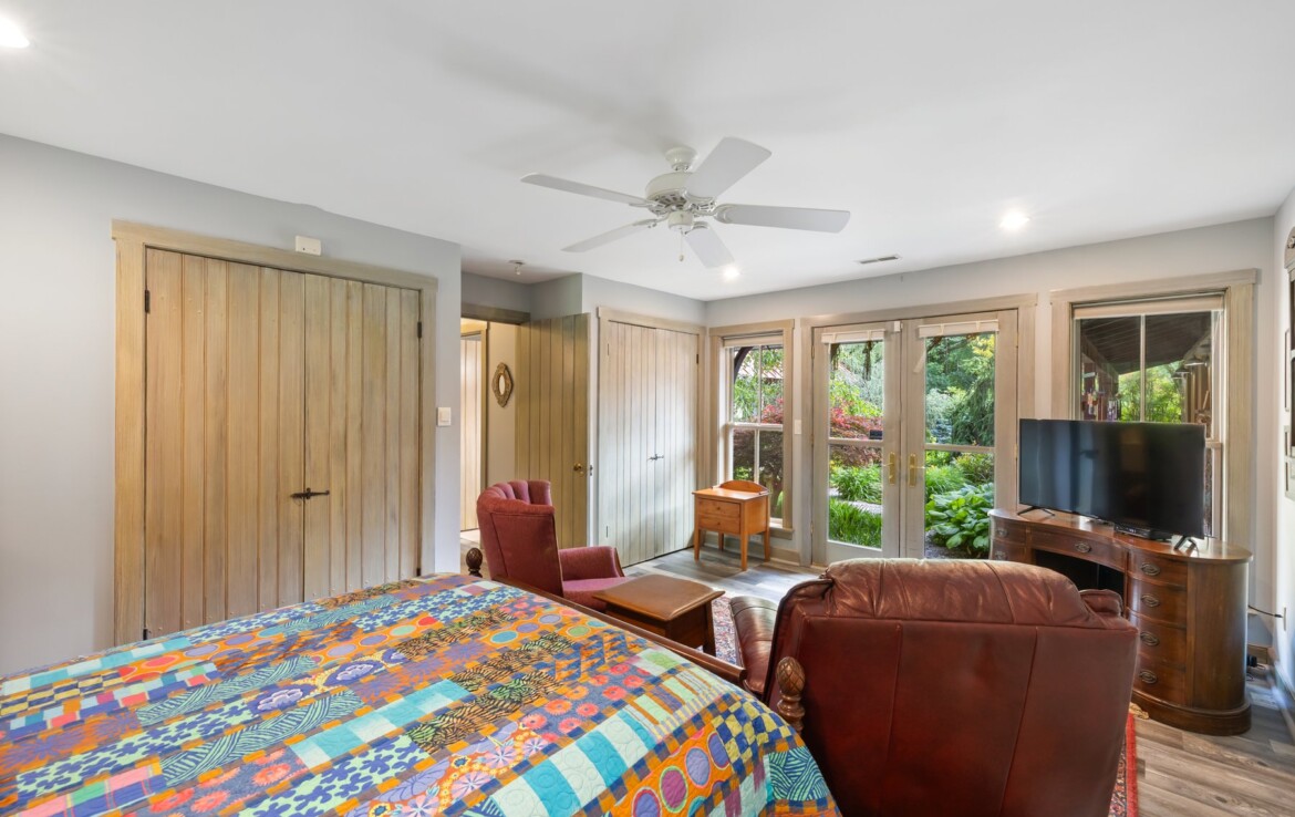 Primary Bedroom Suite 17′ x 14’– Wood floor, ceiling fan, 2 closets, French doors to the courtyard, 4 windows.