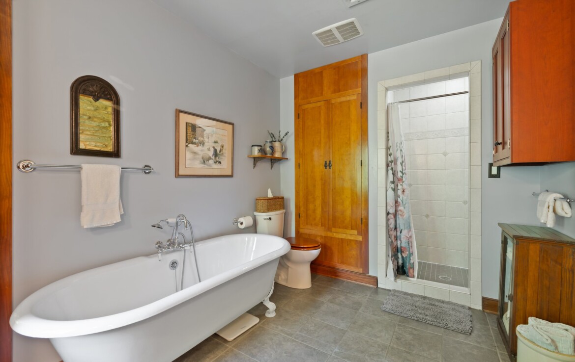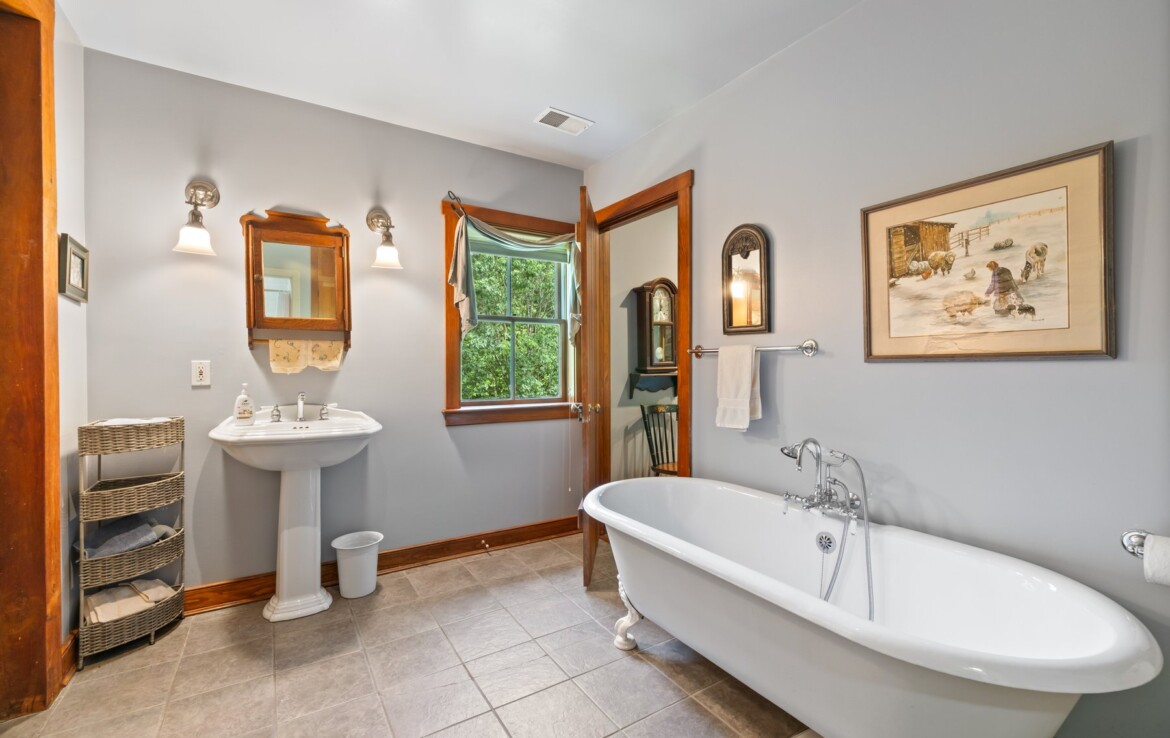 Bathroom 15′ x 8′ – Tile floor, claw foot tub, tiled shower, pedestal sink, recessed lighting, stone fireplace, 1 closet.