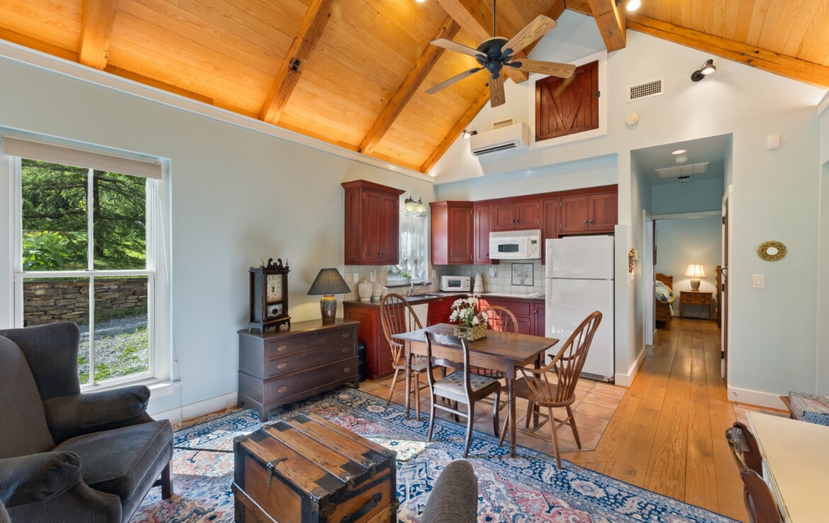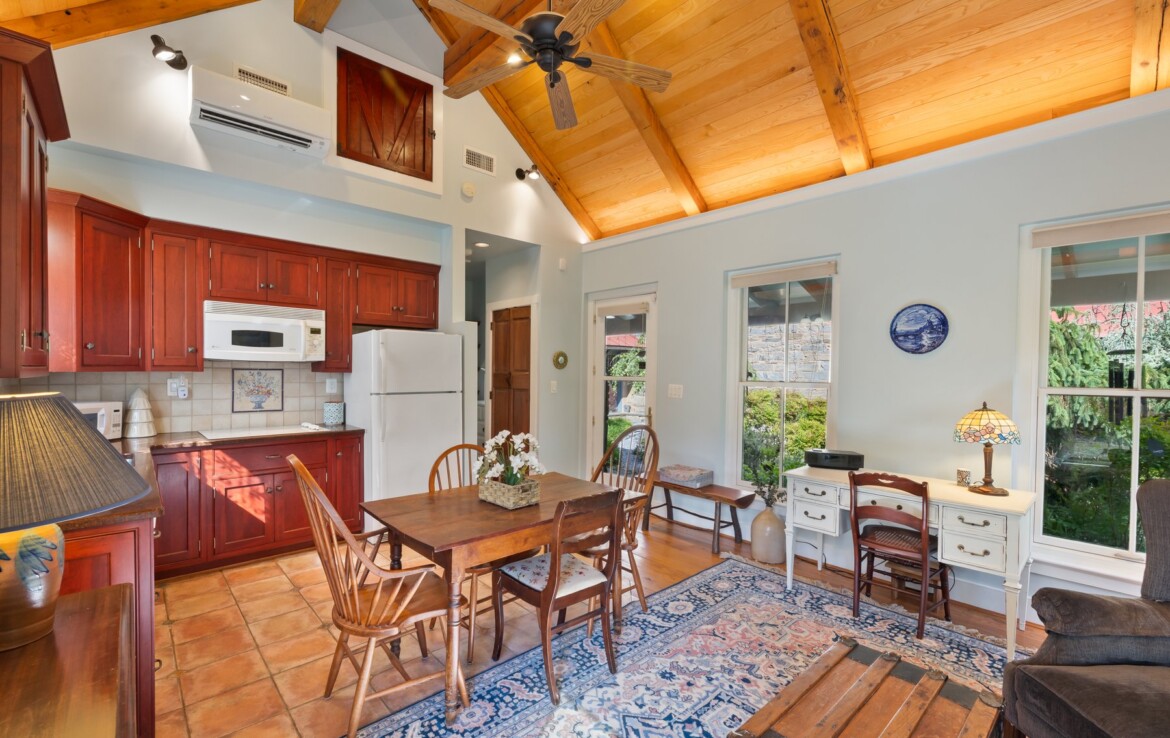 Great Room/Kitchen 16′ x 13′ – Wood floor, tile floor, 15’+ ceiling with exposed wood beams, ceiling fan, Mitsubishi heating/cooling wall unit, granite kitchen counters, courtyard door, French doors to the patio.
