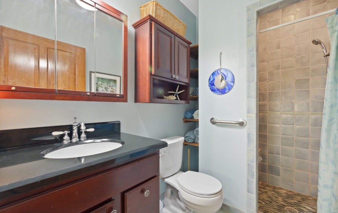 Bathroom 10′ x 5′ – Tile floor, tile shower.