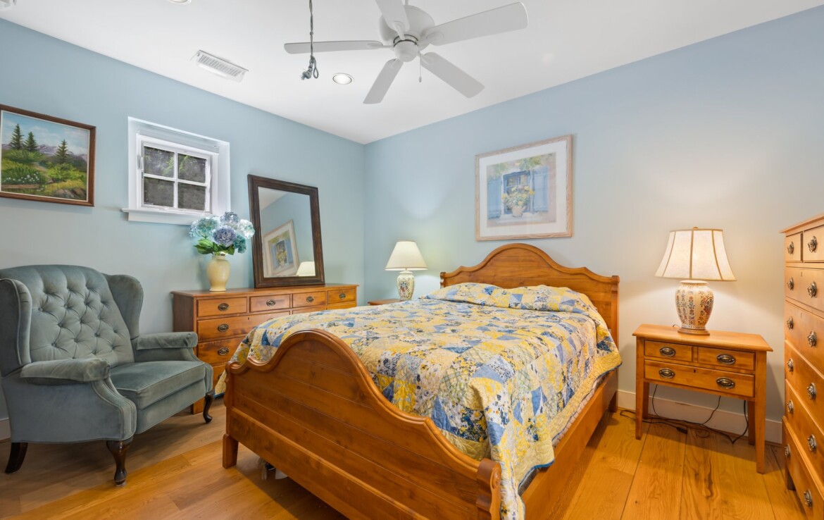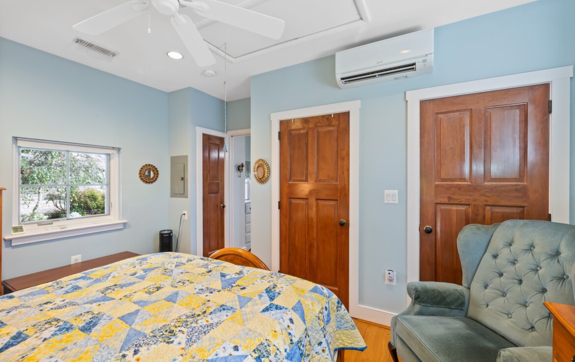 Bedroom 18′ x 14′ – Wood floor, ceiling fan, recessed lighting, Mitsubishi heating/cooling wall unit, 3 closets, 2 windows.