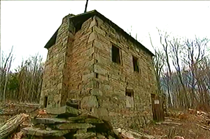 The original core structure of the main house had an exterior stone stairway whose structure and raw stone material, composed primarily of gray mica schist and field quartz, was removed and used during restoration to finish off the third story low walls to support the roof, construct a chimney above the dining room fireplace, and serve as base layers for the first-floor kitchen and extension of the first-floor kitchen chimney to a second-floor bathroom chimney. Note that all roof material for the main house, the addition, and the exterior carport employ standing seam, red sheet metal.